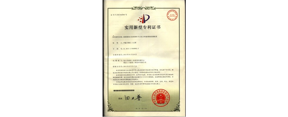 实用新型专利证书(玻璃幕墙预立柱埋件节点拉力性能现场检测装置洪鑫等)